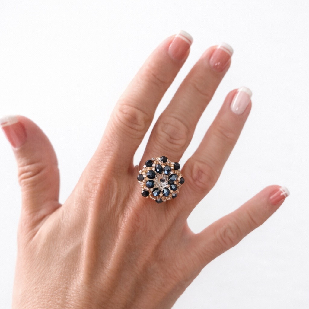 Anillo tejido a mano con cristales y mostacillas checas, con rívoli central que aporta brillo y delicadeza.