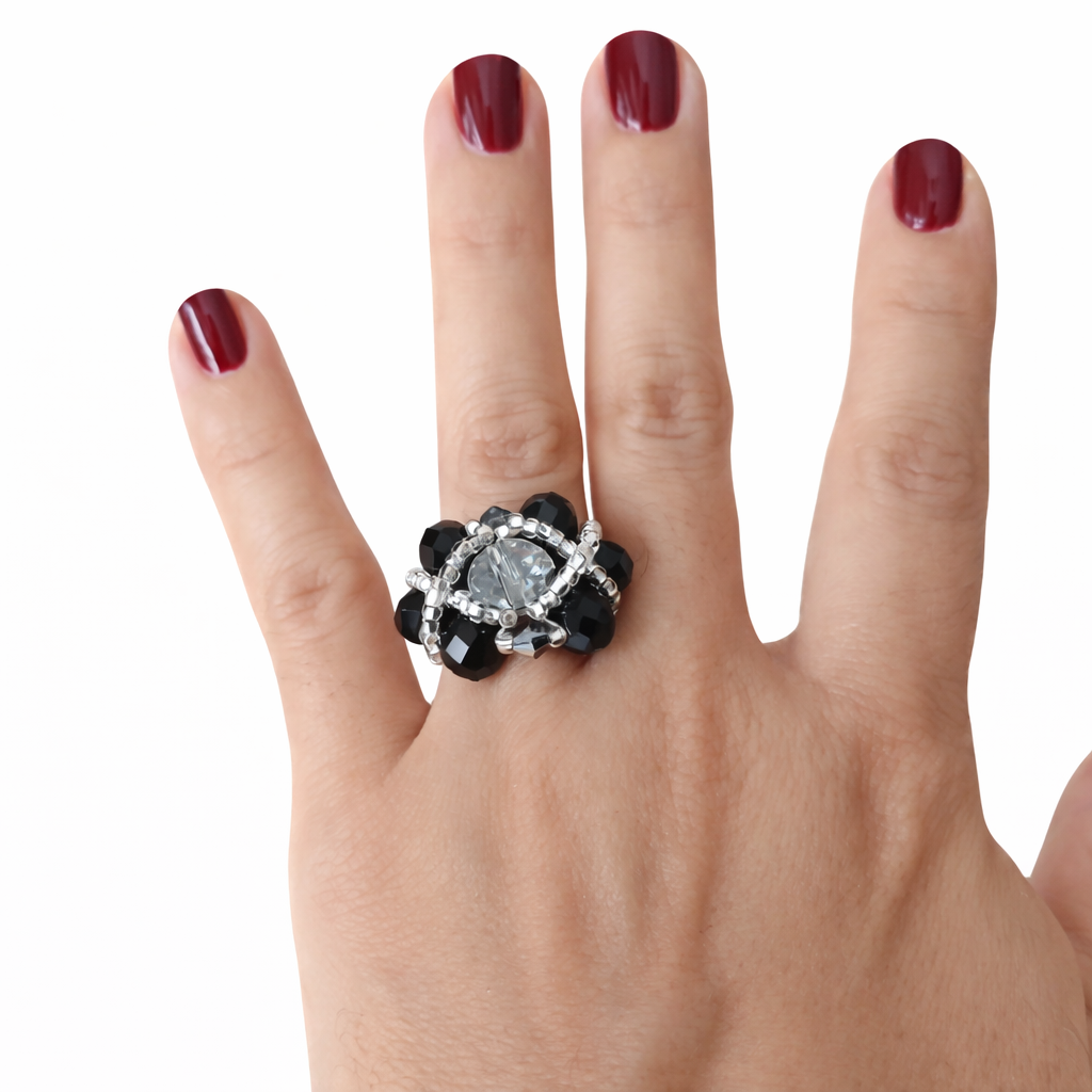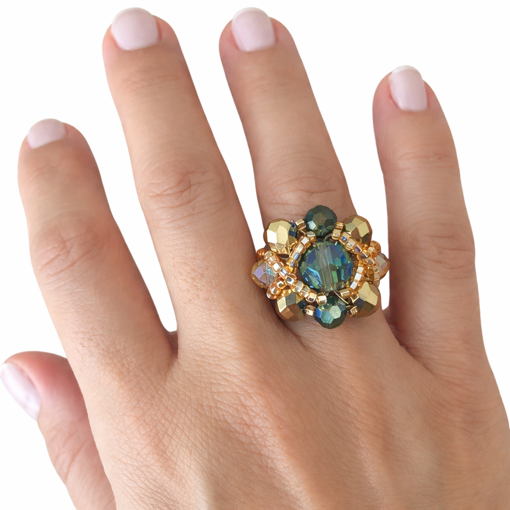 Anillo hecho a mano, totalmente tejido en cristales y mostacillas checas. Muy fino y delicado! Podemos hacerlo en diferentes combinaciones. Consultanos por Whatsapp.