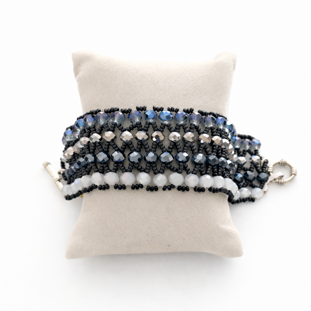 Hermoso brazalete hecho a mano, tejido en cristales de distintos tamaños y mostacillas checas.