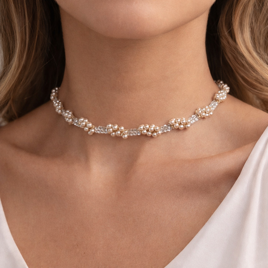 Delicado chocker hecho a mano con perlas y mostacillas checas. Un diseño elegante y versátil que también puede usarse como pulsera de doble vuelta.