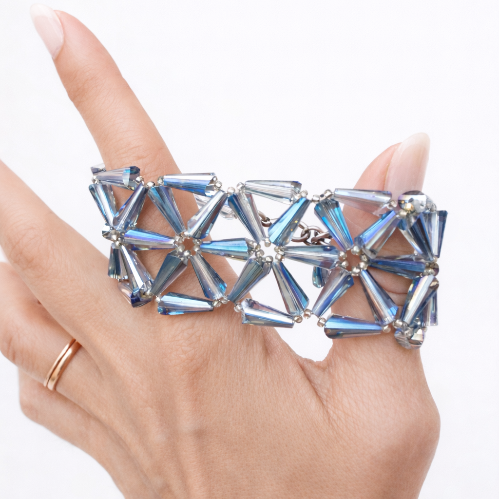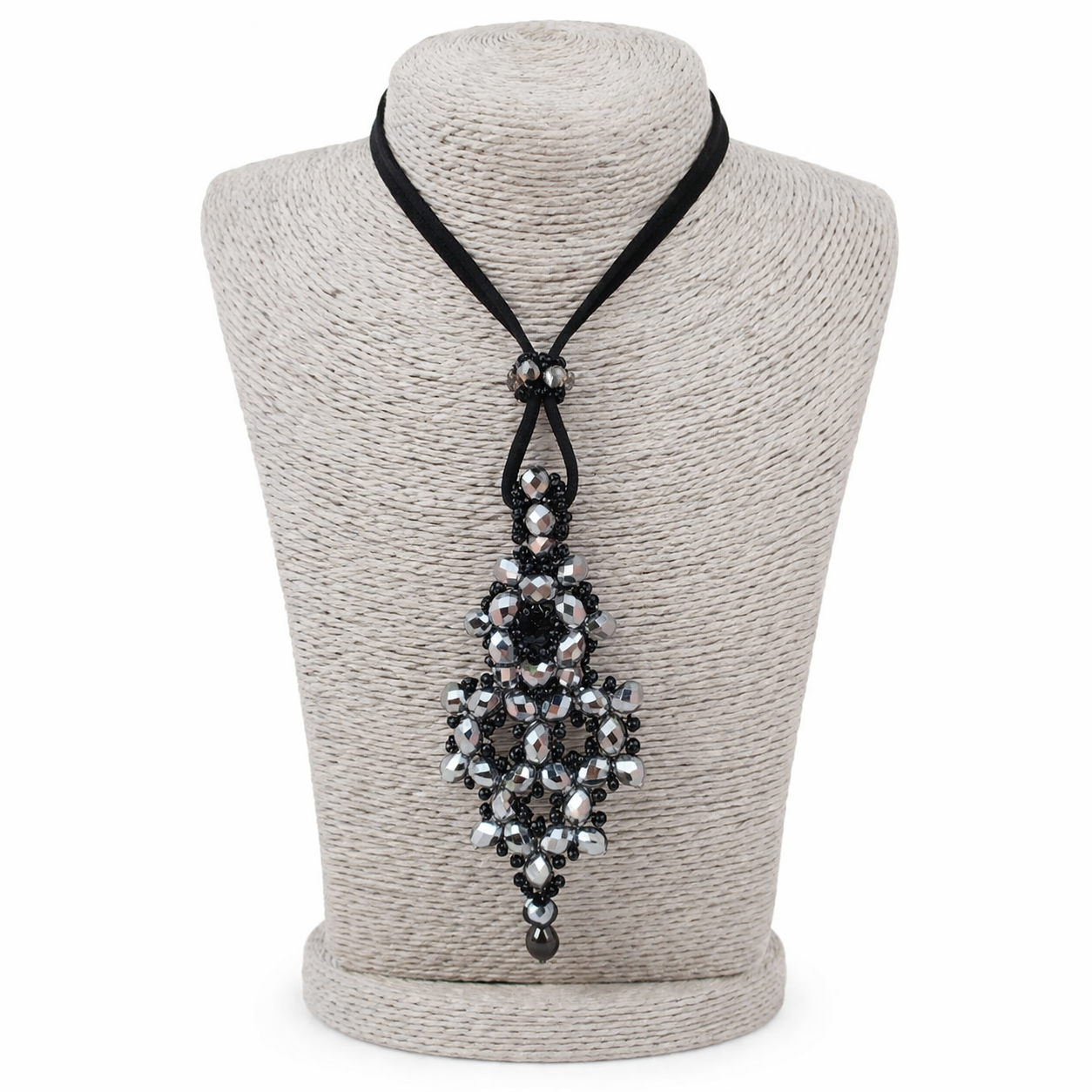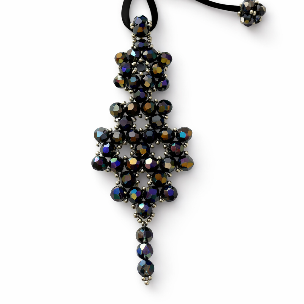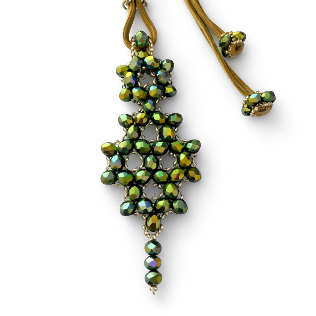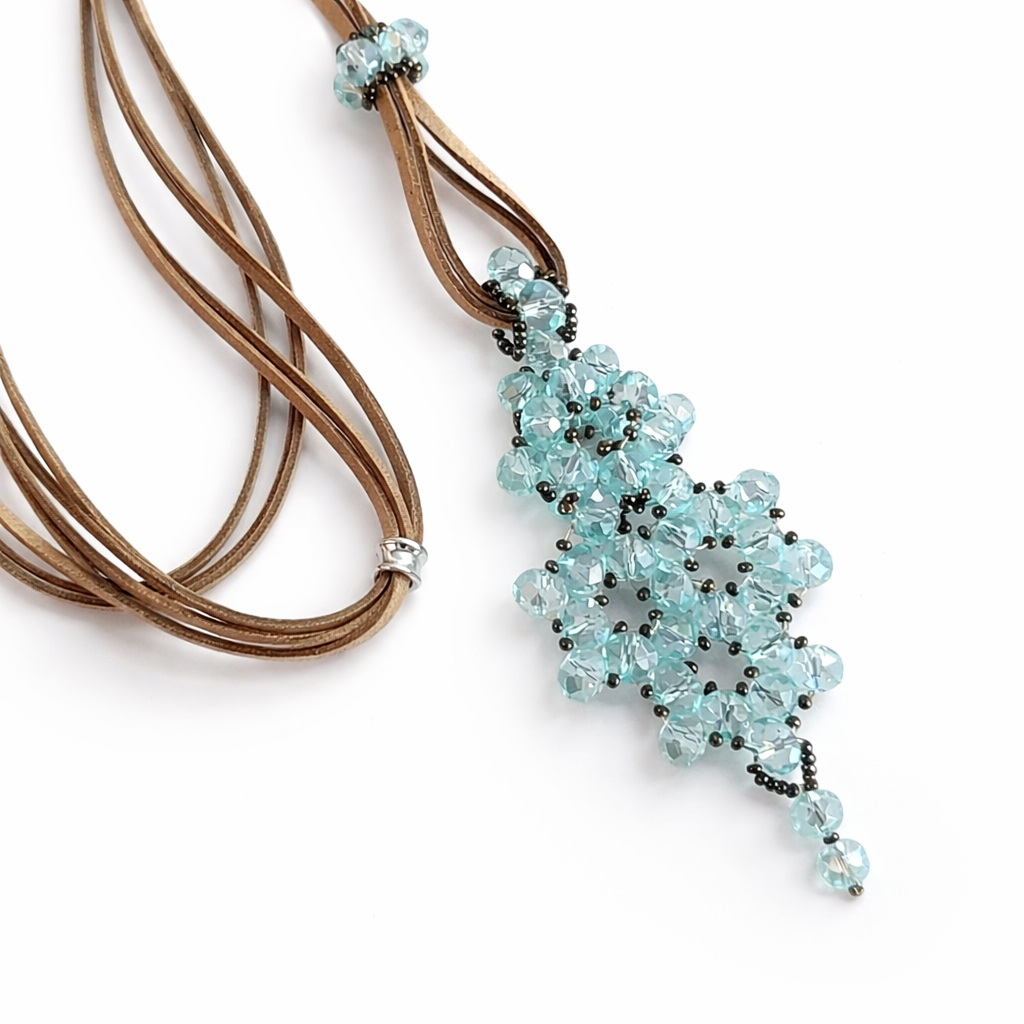 Hermoso dije tejido en cristales y mostacillas checas. El colgante de gamuza es regulable para que lo puedas usar corto o largo.
