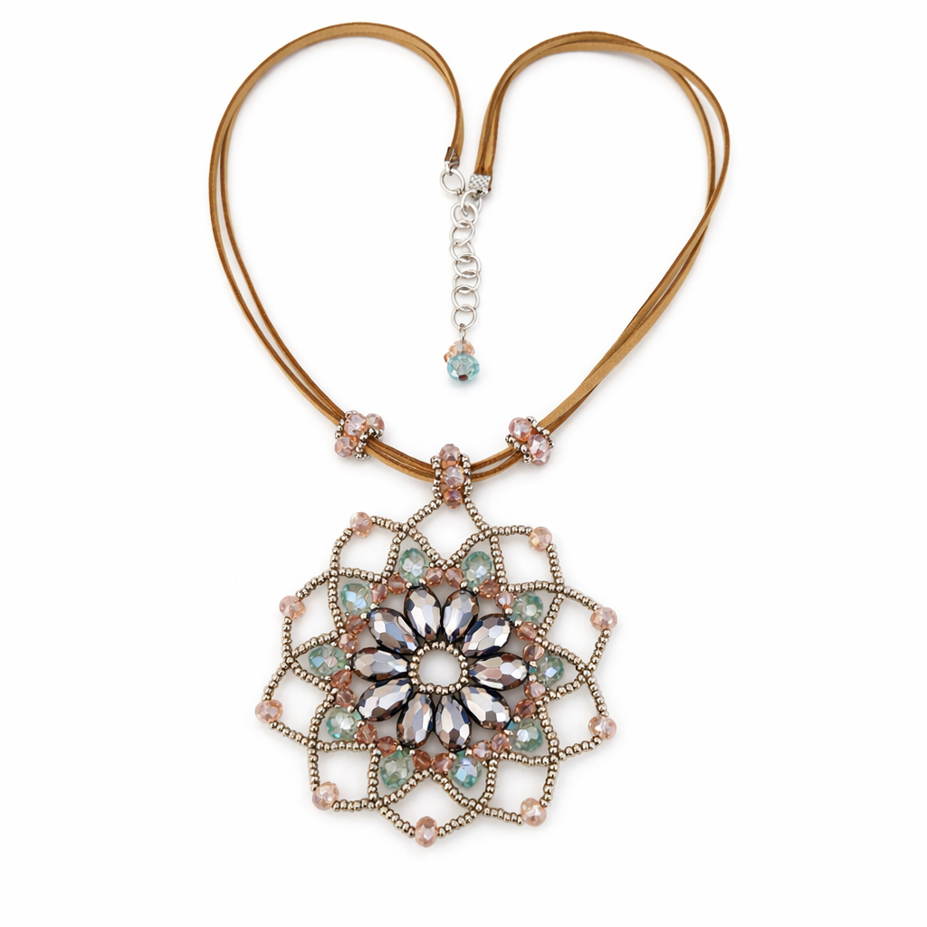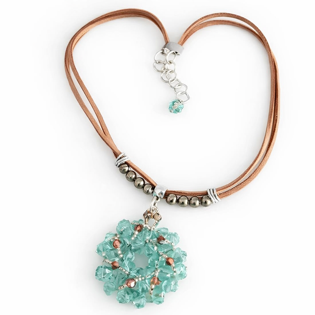 Hermoso dije tejido en cristales y mostacillas checas. El colgante de gamuza es regulable para que lo puedas usar corto o largo.