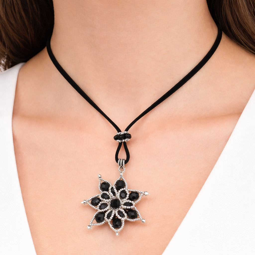 Dije hecho a mano tejido en cristales y mostacillas checas. Con colgante de gamuza regulable.