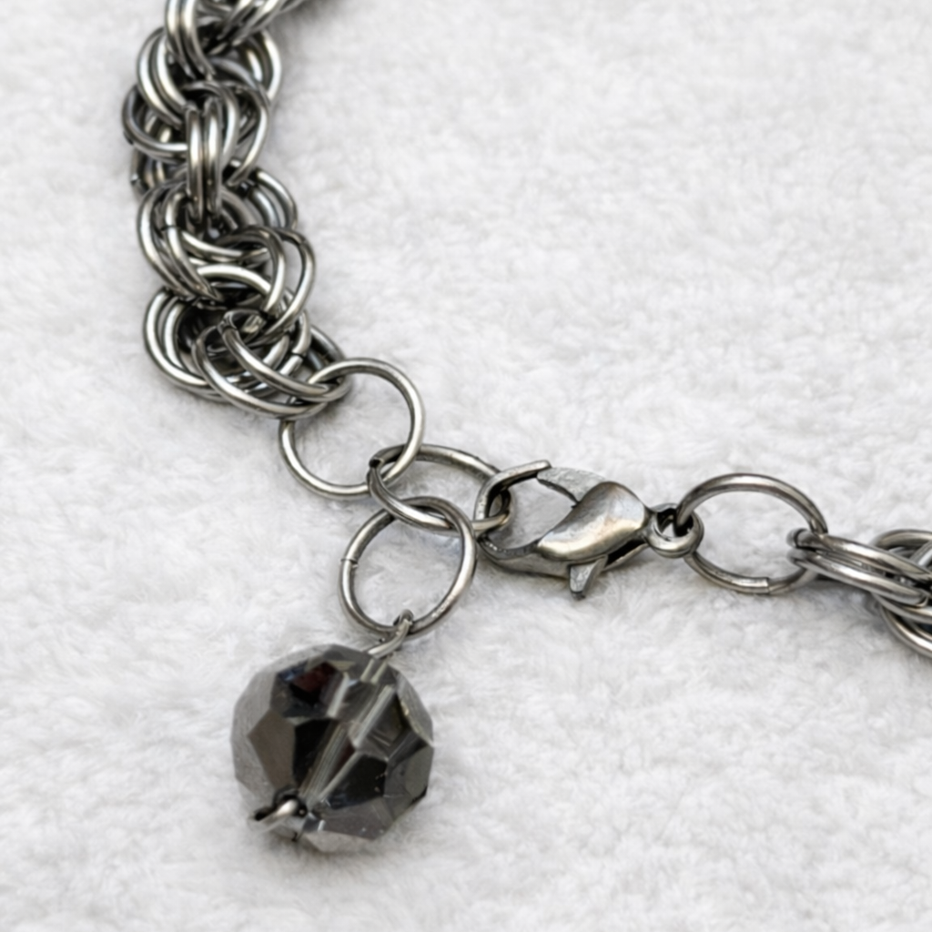 Pulsera artesanal tejida a mano con técnica de tejido medieval (chainmail), realizada con argollas de acero entrelazadas. El diseño se completa con un delicado cristal facetado colgante. Cuenta con cierre mosquetón y cadena de extensión para ajustar cómodamente a tu muñeca.